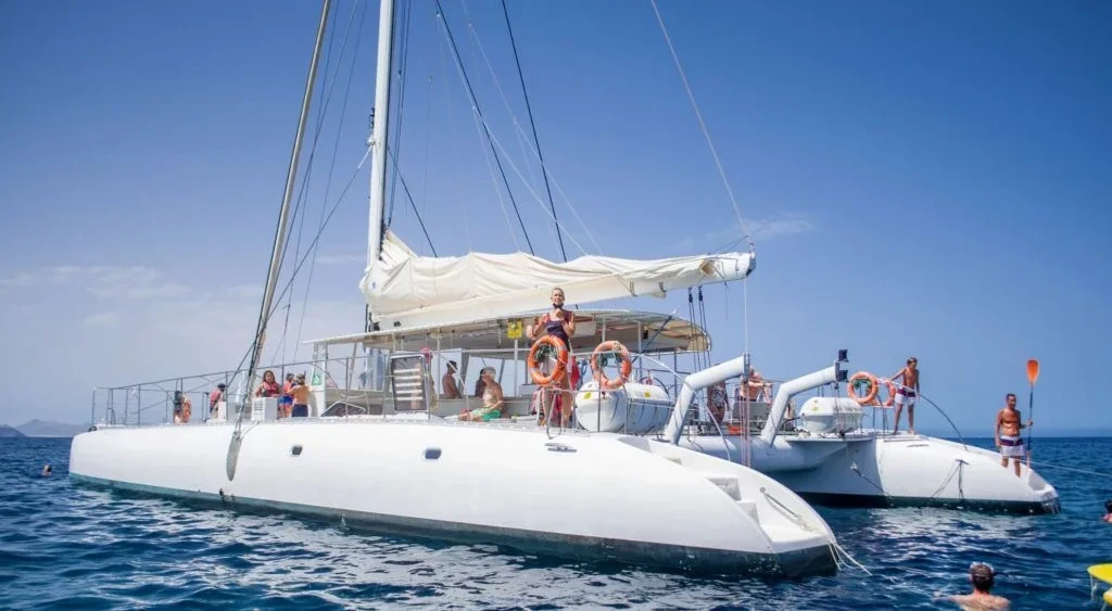 Atraque y actividades: El catamarán se ancla a unos 100 metros de la costa de Papagayo, donde se permanecerá durante dos horas. Durante este tiempo, los pasajeros pueden disfrutar de varias actividades acuáticas como nadar, hacer snorkel, kayak o SUP (paddle surf), todo incluido en el paquete. También hay tiempo para relajarse al sol y disfrutar de las hermosas vistas de la isla. Además, se incluye un almuerzo compuesto por ensalada, pasta y una selección de bebidas como cerveza, vino y refrescos.